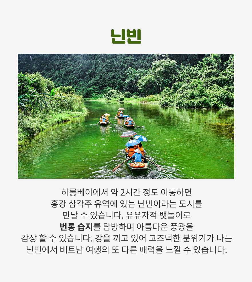 | 2 | 하롱베이 스피드보트+항루언 | 스피드 보트를 타고 하롱베이 섬 사이 기암절벽이 경이로운 항루원 관광 | $50/인 | 약 1시간 | 선상에서 휴식 | 선상 | 현지인 가이드 동행 |